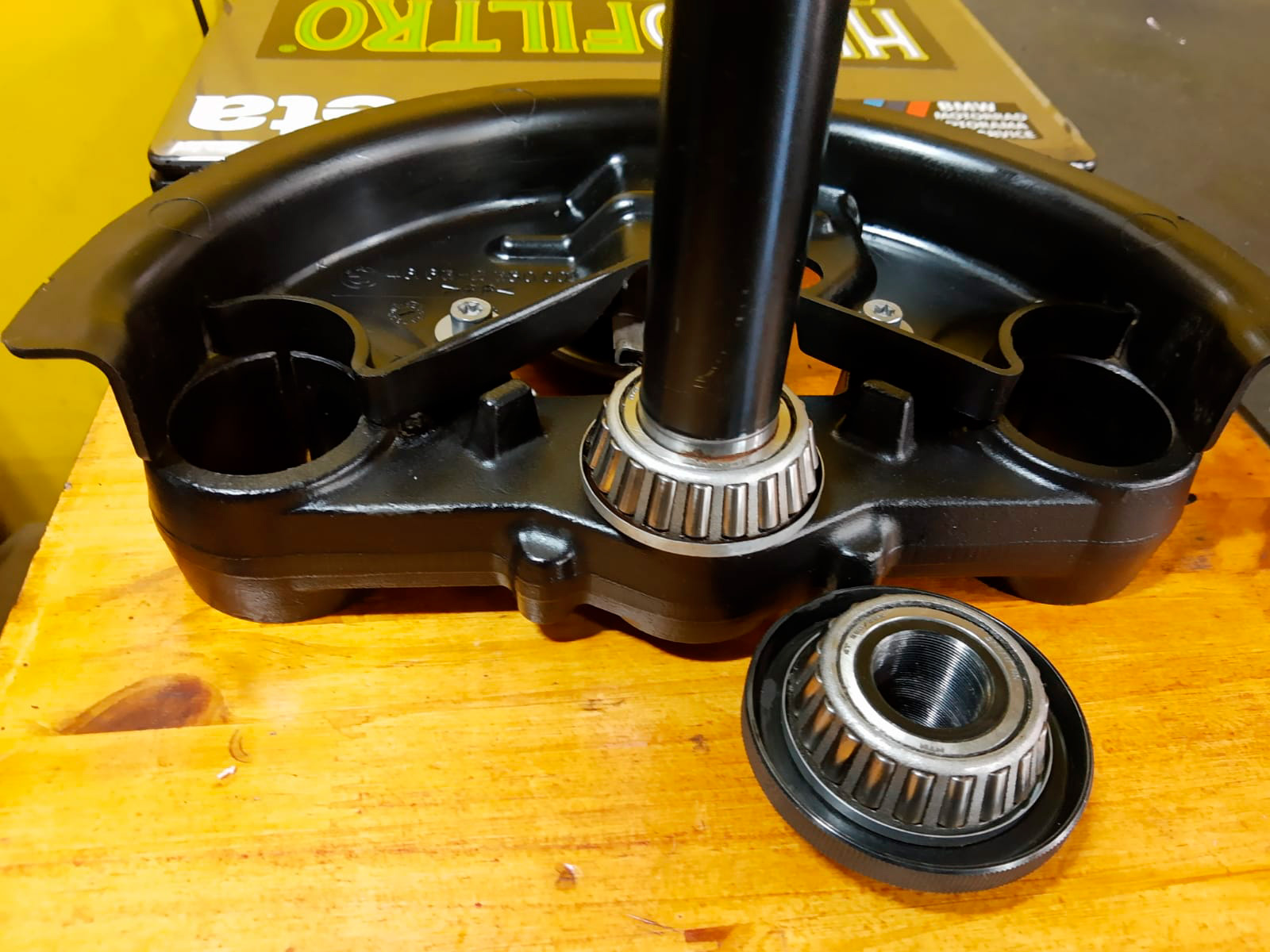 A caixa de direção é um conjunto de dois rolamentos, que devem ser limpos e lubrificados a cada tanto, para que não se precise trocar, embora, em algum momento, estes apresentaram folgas ou calos.